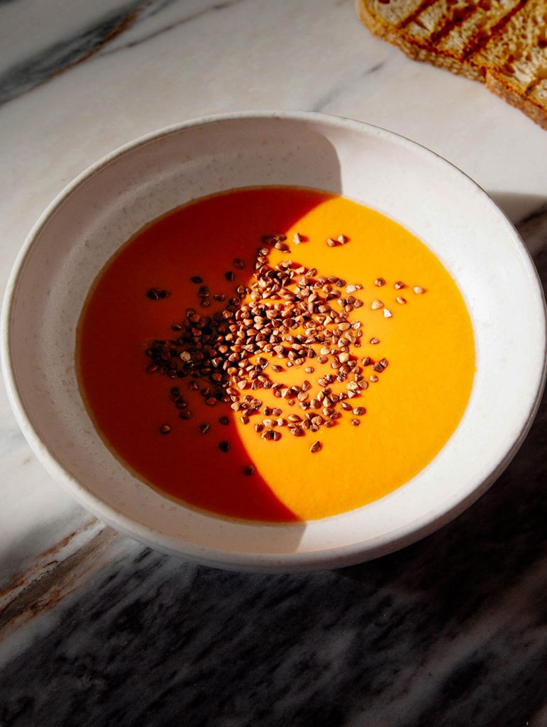 Gazpacho mit Burrata und gerösteter Buchweizen – das perfekte Topping