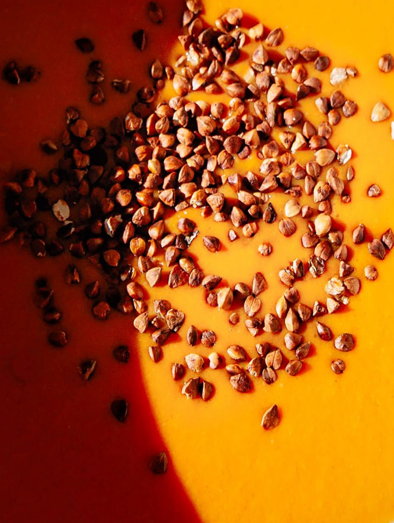 Mit cremiger Burrata und dem gerösteten Buchweizen garnieren. Ein Spritzer Olivenöl und frische Kräuter runden das Gericht ab.