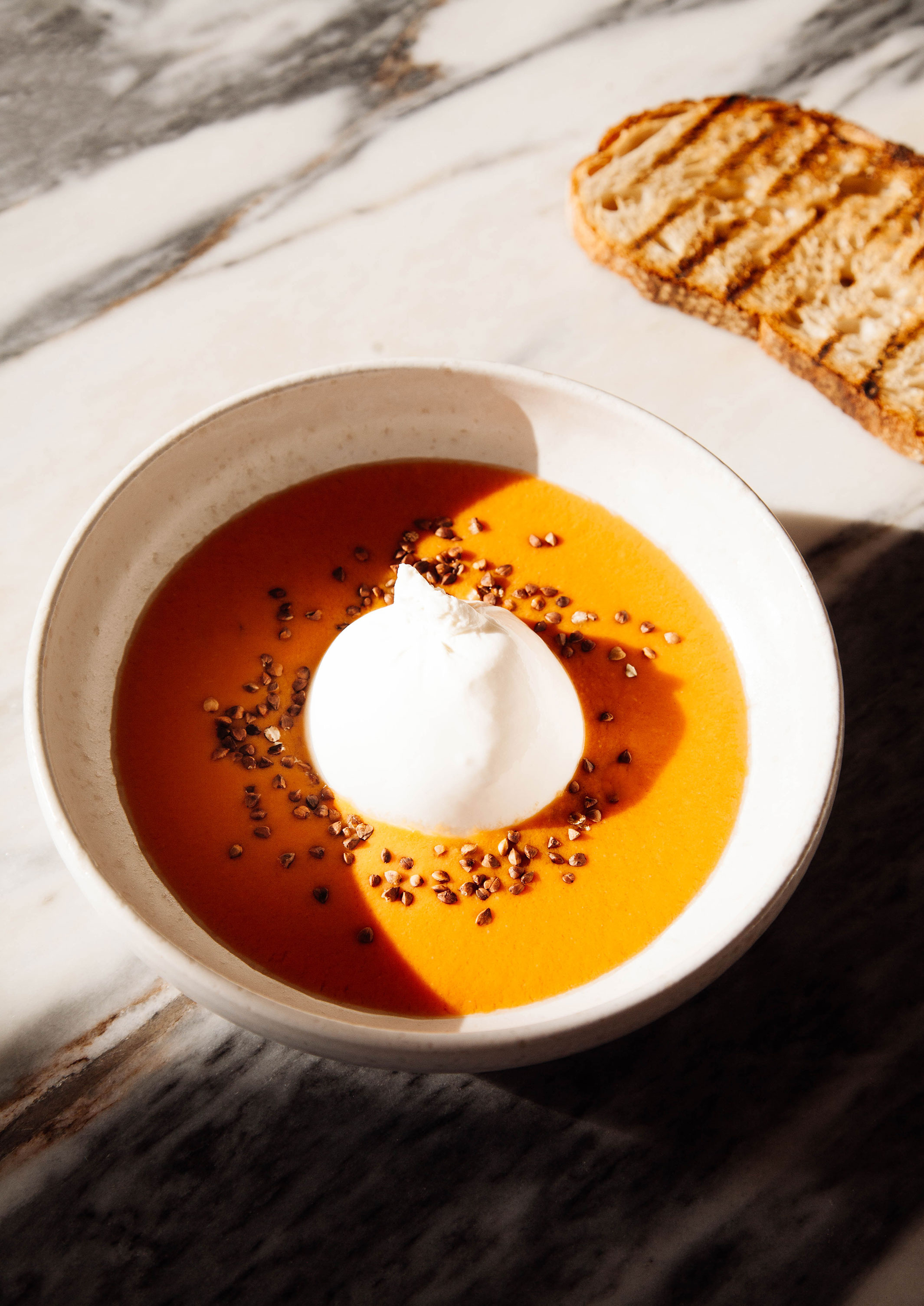 Am darauffolgenden Tag die Suppe durch ein feines Sieb streichen, um Kerne und grobe Stücke zu entfernen. Dadurch wird sie besonders samtig und fein in der Textur.