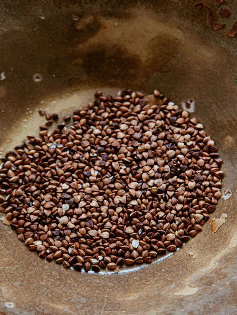 Den Buchweizen in einer trockenen Pfanne ohne Fett goldbraun rösten, bis er leicht nussig duftet. Anschließend abkühlen lassen.